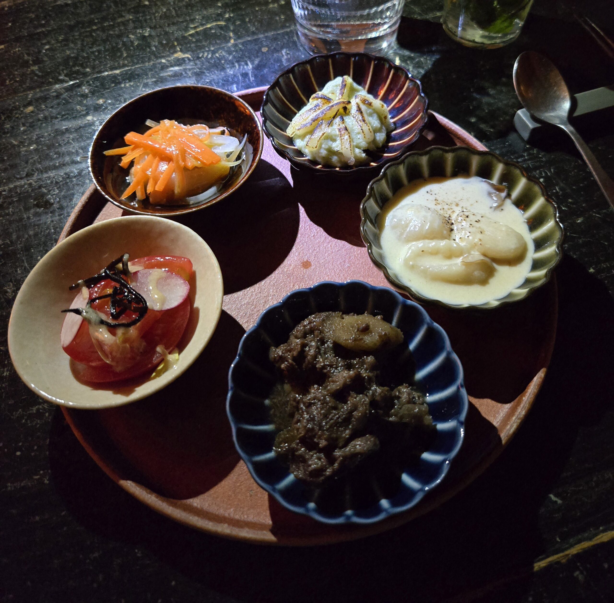 牡蠣のエスカデッシュ・トマトと塩昆布のカプレーゼ・牛すじと牛蒡の赤ワイン煮込み・ジャガイモのニョッキと木の子と白カビチーズクリームにトリュフを散らして・鱈のブランダード
