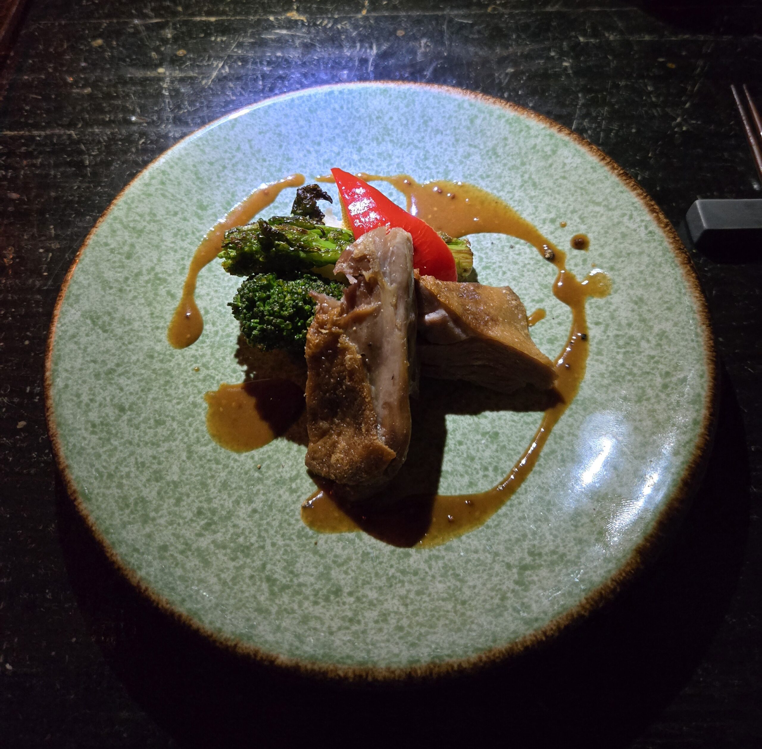 愛知鴨肉にマスタードソースとマッシュポテトとパプリカなどの蒸し野菜を添えて